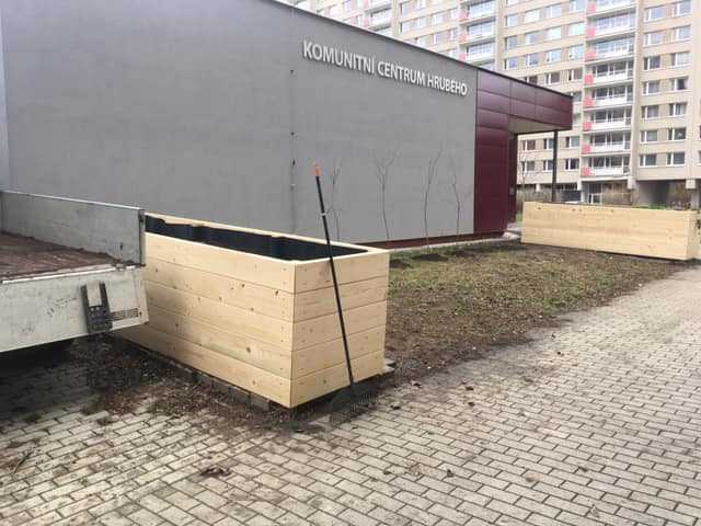 Zahrádka se nově přesunula před hlavní vchod do vyvýšených dřevěných záhonů, které vznikly díky podpoře Městské části Praha 8.
